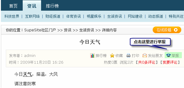 会员登录站点后,查看某一篇资讯,打开后,右下角有举报的链接,如下图所示: