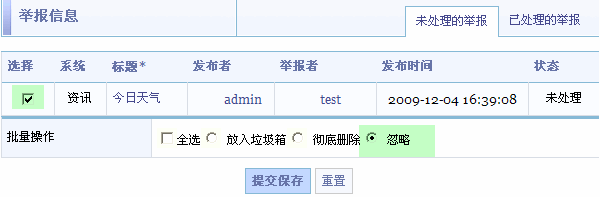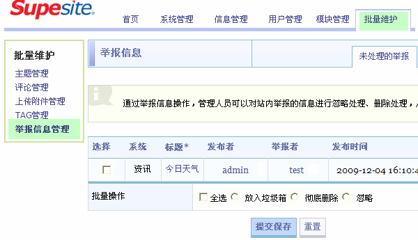 SupeSite 7.5 后台 => 批量管理 => 举报信息管理