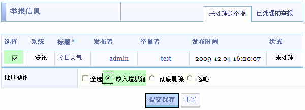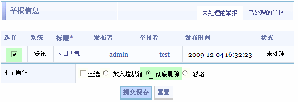 通过 SupeSite 7.5 的举报信息管理功能,可以将会员举报的不良信息进行放入垃圾箱、彻底删除、忽略的操作。