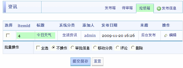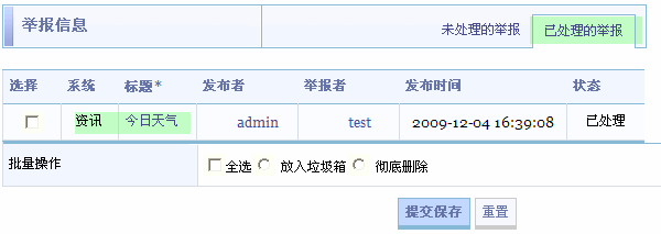 这时在信息管理 => 资讯管理 中可以看到,该被举报的资讯已经被在垃圾箱中了,同时不会在前台显示。