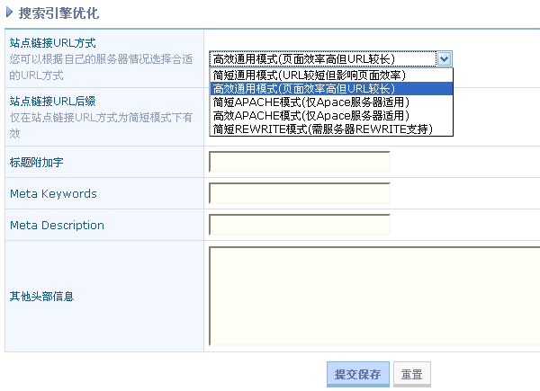 1)如果您用的是 Apache 服务器,建议选择高效 Apache 模式,这样虽然 url 链接比较长一些,但是不会影响页面效率。