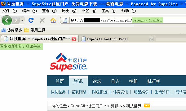 设置完毕后,进行缓存更新,进入 SupeSite 前台,如下图所示,