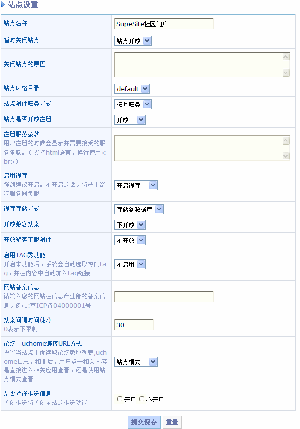 站点设置是针对 SupeSite 站点进行一些全局设置,通过站点设置可以对站点基本信息、站点风格目录、注册服务条款、附件存放方式等进行详细的参数设定。