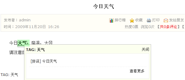 13、启用 TAG 秀功能:启用后,系统会自动选取热门 TAG,并在内容中自动加入 TAG 链接。如下图所示: