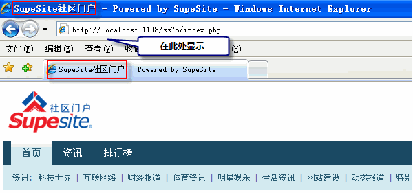 1、站点名称:默认为 “SupeSite 社区门户”,站长可以把这个名称改为自己站点的名字。这个名称主要在用户访问站点的时候,在浏览器标题中显示。