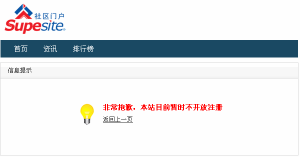 6、站点是否开放注册:如果选择“不开放”,则站点将不能新注册会员。会员注册的时候提示如下图所示:
