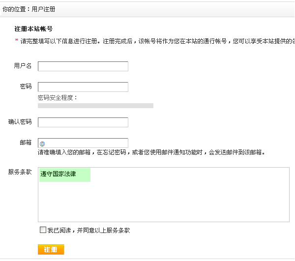 7、注册服务条款:这里填写注册的条款,此处支持 html 语言。会员注册的时候会看到,效果如下图所示: