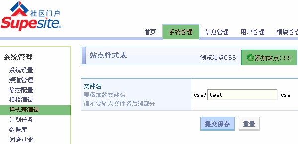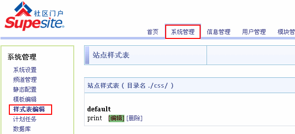进入 SupeSite 7.5 后台 => 系统管理 => 样式表编辑: