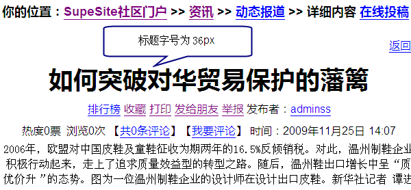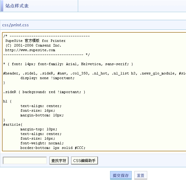 说明:全新安装的 SupeSite 后台样式表编辑这里只包含 print.css 一个样式表文件,这个样式表是针对文章打印页面的样式控制,并不是浏览器的浏览页面样式表编辑,网站在浏览器里的所有样式都是在 ./templates/default/css/common.css(以默认模板举例)文件控制的,后台并没有修改的地方,直接修改文件即可。