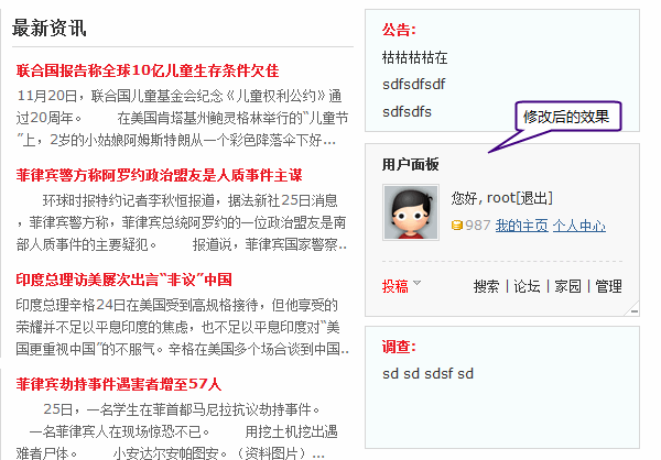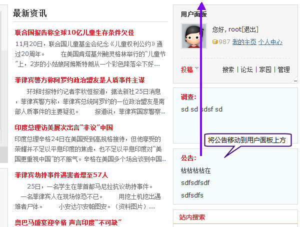 我们的目标:要把首页右侧“公告”放在“用户登录”上方的位置。原首页摆放位置,如下图所示: