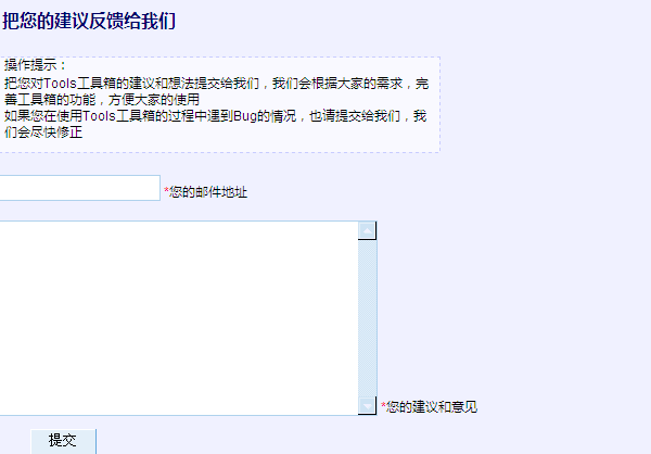 反馈建议功能把广大用户用Tools工具箱的建议提交,可以完善工具箱的功能,方便大家的使用。