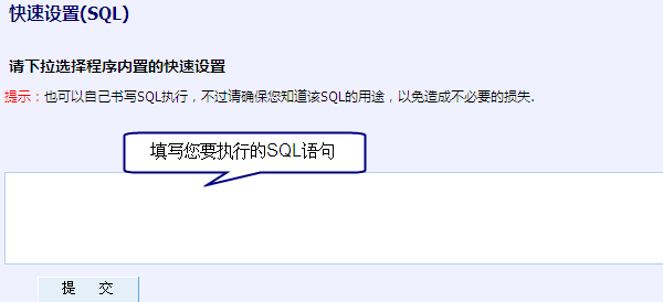此功能适合高级用户,可以执行一些对数据库操作的 SQL 语句。书写SQL执行,不过请确保您知道该SQL的用途,以免造成不必要的损失。
