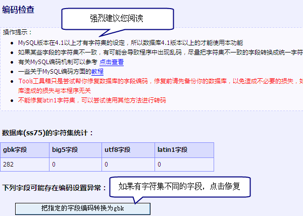 本功能对所有数据表进行编码检查,如果有字段的编码与主要的编码不一致,能够在一定的情况下利用tools修正。