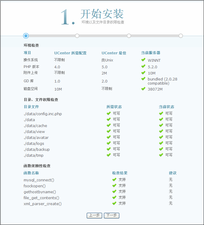 上图中阅读授权协议后点击“我同意”就进入到下面的环境检查和文件权限目录检查页面,如下图所示:
