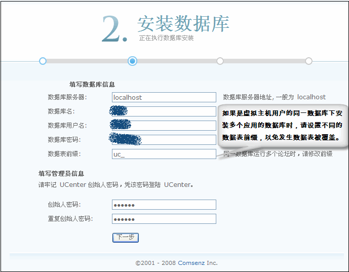 检查配置过关后点击“下一步”进入数据库信息配置页面,如下图所示: