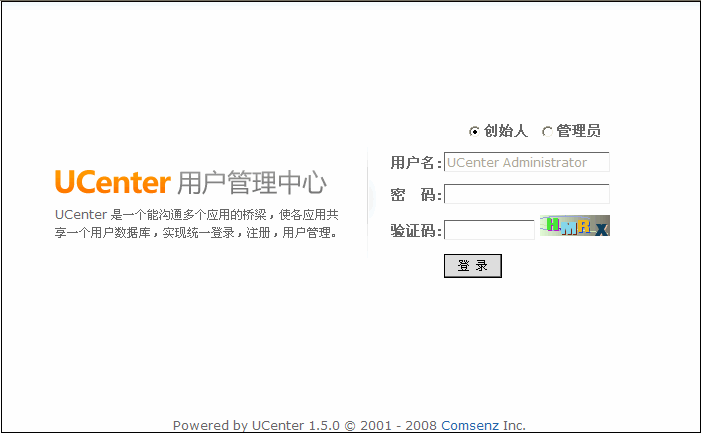 数据库安装完毕点击“安装用户中心成功,点击进入下一步”则自此 UCenter 安装完毕,进入 UCenter 后台登录界面,如下图所示: