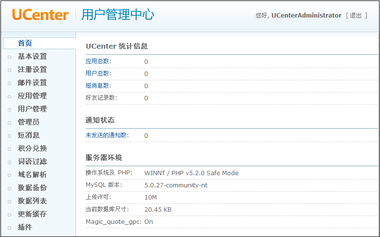 输入密码后点击“登录”进入到 UCenter 的后台,如下图所示: