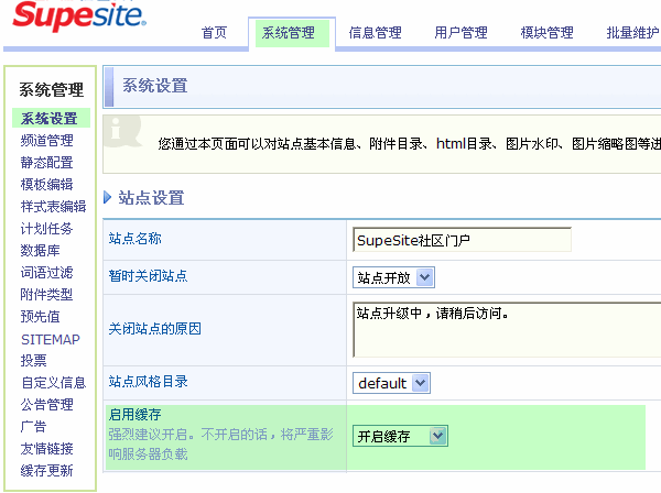 SupeSite 7.5 后台 => 系统管理 => 系统设置 => 启用缓存,选择开启缓存,如下图所示: