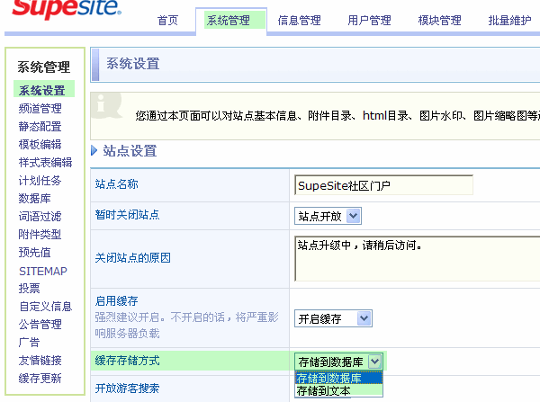 SupeSite 7.5 后台 => 系统管理 => 系统设置 => 缓存存储方式