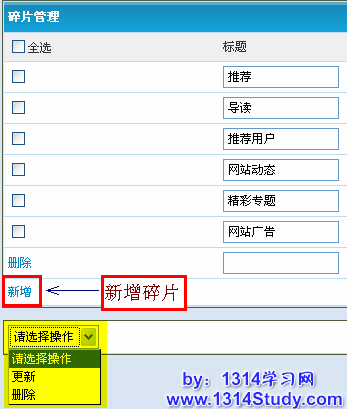 打开 SupeV 的“管理面板”,点击“内容管理”里的“碎片管理”,在此增加或者删除碎片。