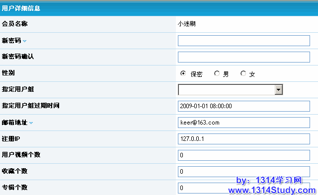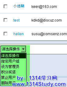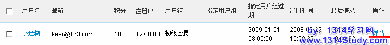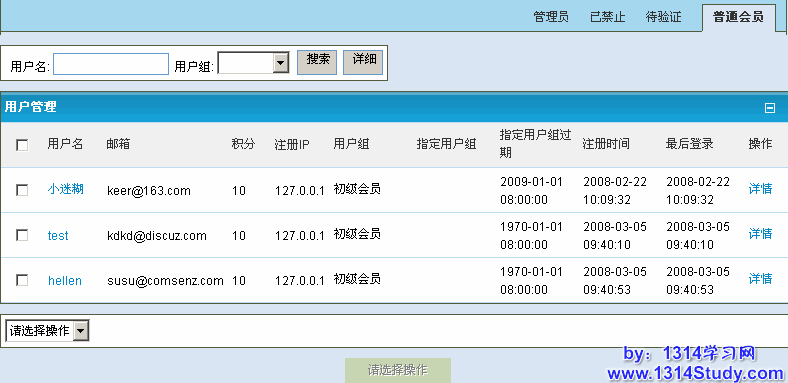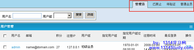 这里可以显示所有注册的会员。包括他们的用户名、邮箱、积分、注册IP、用户组、指定用户组、指定用户组过期时间、注册时间和最后登录时间。