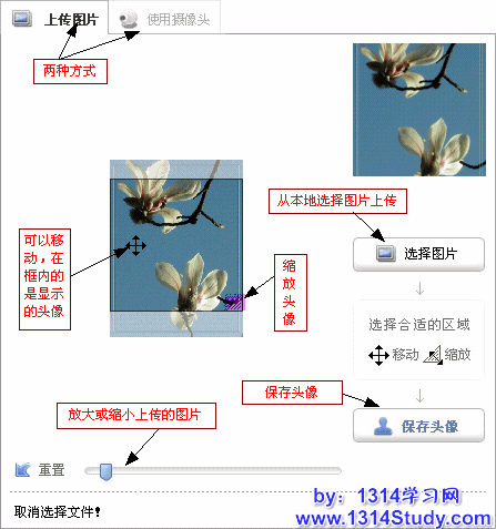 您还可以更换自己的头像,包括两种方式:上传图片和使用摄像头,请见下图: