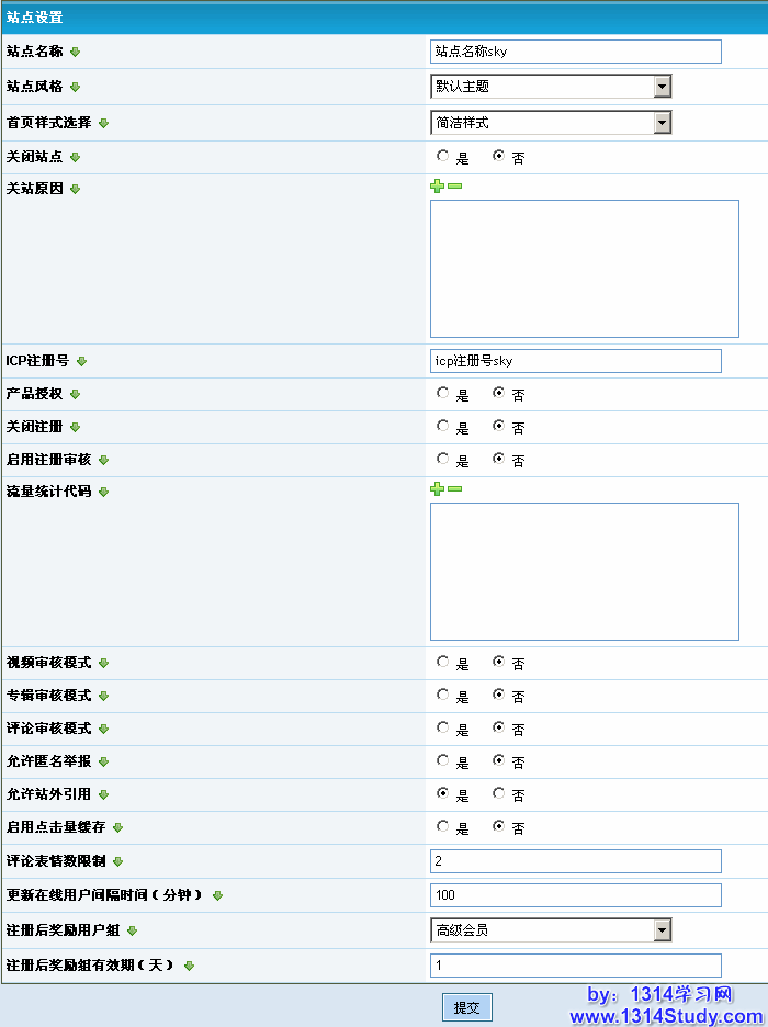 SupeV 后台的全局设置 => 站点设置里主要包含的是关于整个站点的一些设置性的信息,如下图所示: