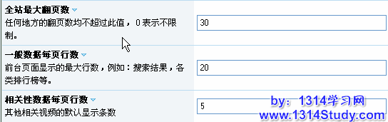 全站最大翻页数指的是任何地方的翻页数均不超过此值,0 表示不限制。一般数据每页行数指的是前台页面显示的最大行数,例如:搜索结果,各类排行榜等。相关性数据每页行数指的是其他相关视频的默认显示条数。如下图所示: