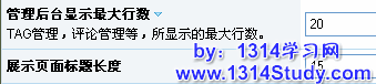 管理后台显示最大行数主要功能是后台的TAG管理,评论管理等,所显示的最大行数。展示页面标题长度指的是前台的页面的标题的最大长度等等,如下图所示:
