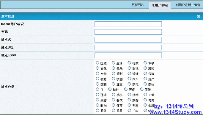 如果您已经拥有一个 Insenz 帐号,但是还未将帐号绑定到 SupeV 站点,那么请点击“老用户绑定”,如下图,填写您的 Insenz 帐号信息以及站点信息。