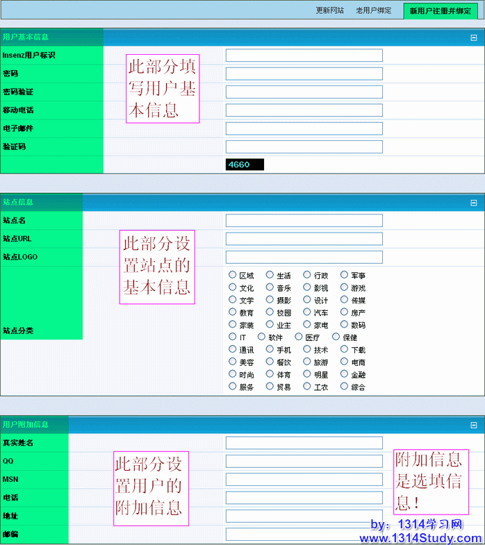 如果您还未拥有一个 Insenz 帐号,请点击“新用户注册并绑定”,在此注册一个 Insenz 帐号,同时绑定到 SupeV 站点。如下图,请填写您要注册的用户名,密码等个人信息和站点信息。