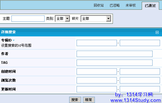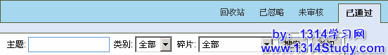 搜索时首先选择大的分类:回收站,已忽略,未审核,已通过;