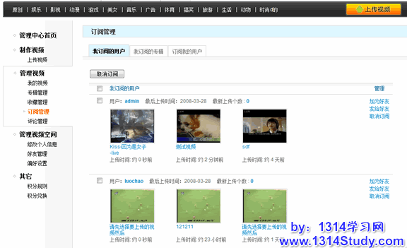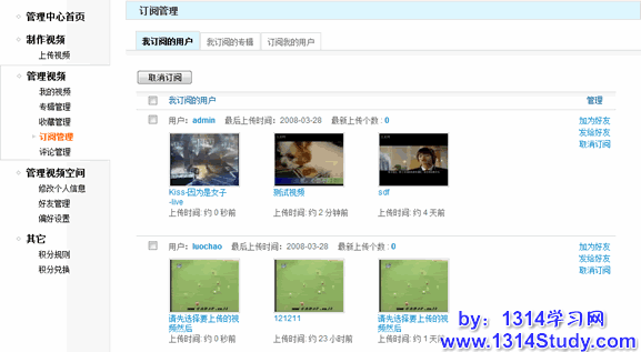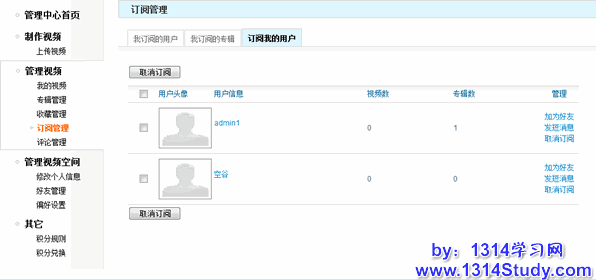 在这里可以查看到所有订阅了“我”的用户的用户头像、用户信息、视频数、专辑数,还可以通过点击“加为好友”将他加为好友,点击“发短消息”向他发送短消息。