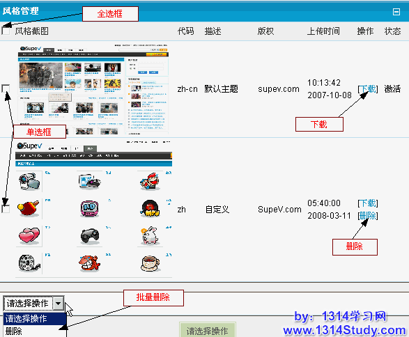 网站的皮肤是用户对站点最直观的体验,SupeV 提供了方便的风格管理功能,您可以上传并使用自己喜欢的风格,也可以把风格下载下来,稍作修改上传后又是一套崭新的风格,下面请看详细介绍: