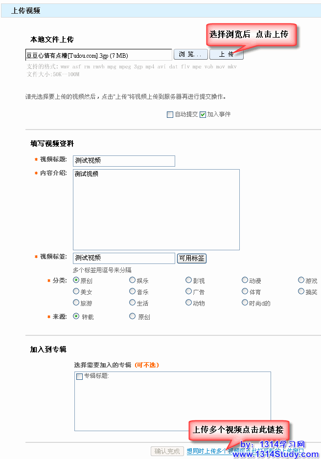 1、本地文件上传:点击“浏览”,选择本地视频文件上传,选择完毕后点击“提交”,会提示“上传完成”;