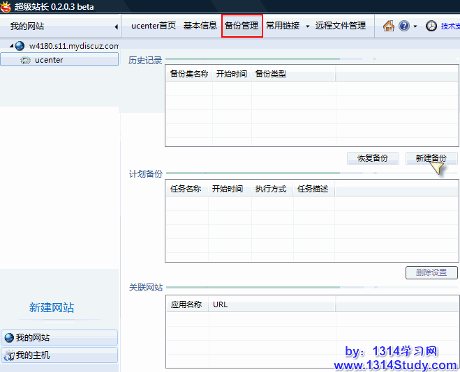 打开超级站长 => 我的网站 => 左侧选中要备份的网站 => 备份管理: