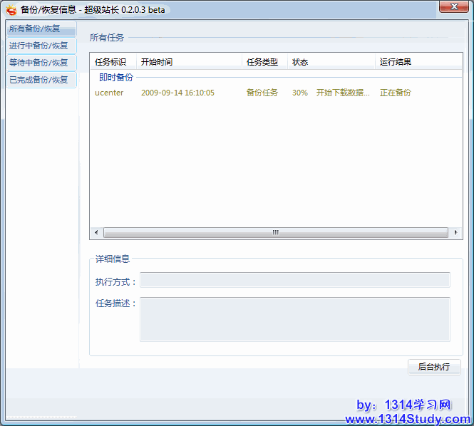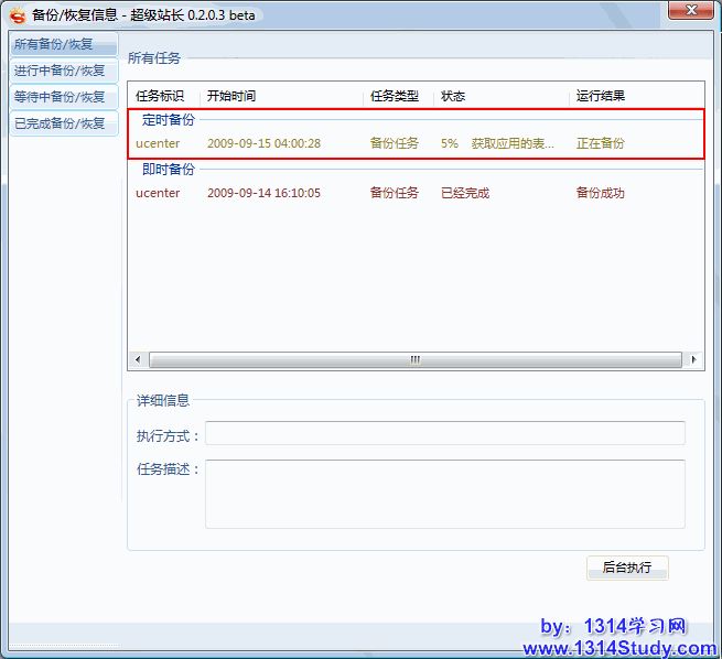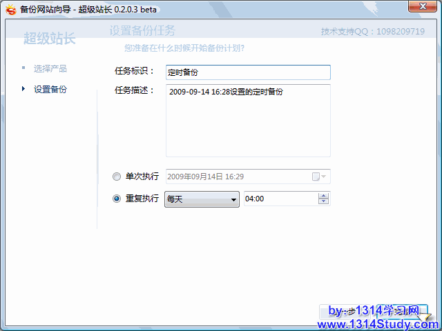 上面是普通的手动备份,下面讲一下如何设置计划备份,也就是定时备份网站,只要一次设置完成,超级站长将定时启动网站的备份,让站长无须时刻担心网站数据安全。