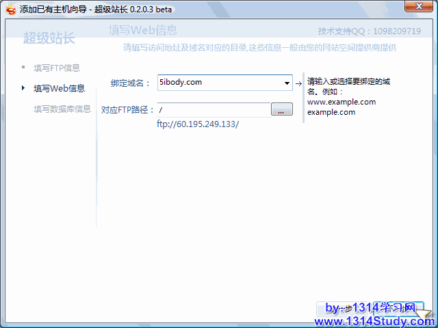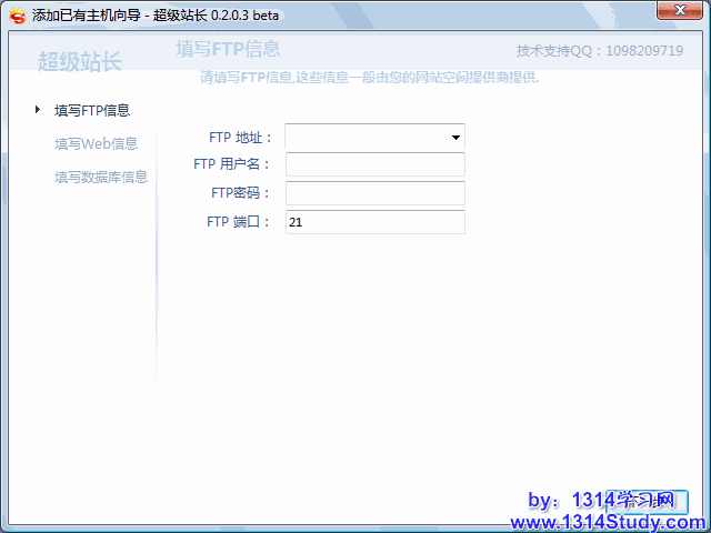 填写好已有的空间 FTP 地址、用户名、密码、端口后点击“下一步”填写 Web 信息: