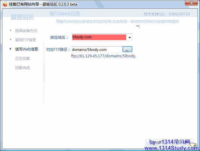 填写好“绑定域名”和“对应FTP路径”(点击浏览按钮选择路径,不要手动输入)后点击“下一步”开始挂载: