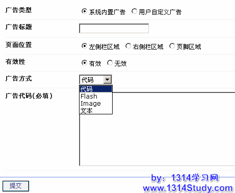 5、广告方式:分为四种方式分别是代码方式、flash、image 和文本方式