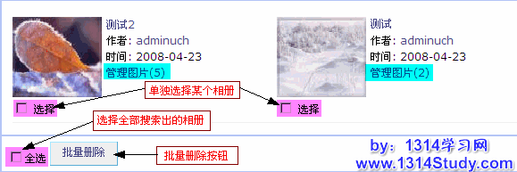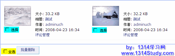 上述是删除一个或多个相册,您也可以对某个相册中的一个或多个图片执行删除操作。点击上图中蓝色的管理图片,即可看到下图所示: