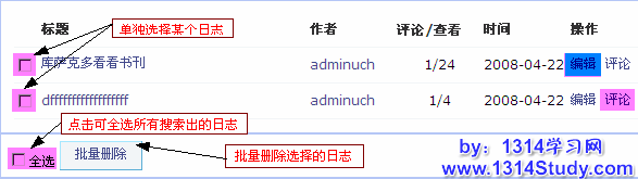您或许想对用户发表的日志进行编辑,或日志太多的情况下,对过期或其他不必要的日志进行删除,UCHome 后台提供了方便的日志批量管理功能,可以满足您的这个需求。下面请看详细介绍:
