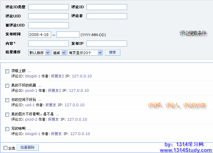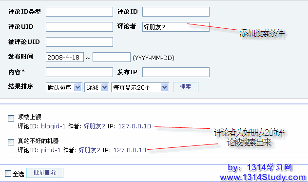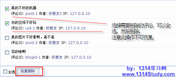用 UCHome 的管理员帐号登录后台,点击上方菜单中的评论,再点击左侧菜单批量管理中的评论,即可看到下图所示: