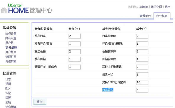 减少积分的操做有:日志被删除、评论/留言被删除、话题被删除、回帖被删除、获取注册邀请码、搜索一次、兑换1M的上传空间、日志导入。