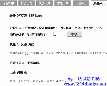 可以邀请通过QQ、MSN等IM工具,或者发送邮件的方式邀请好友注册。邀请一个好友注册成功,可以获得积分 2 个。