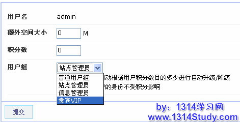 1、编辑用户:点击用户名后的“编辑”进入编辑页面,可以修改用户的额外空间大小、积分数值以及所属用户组;