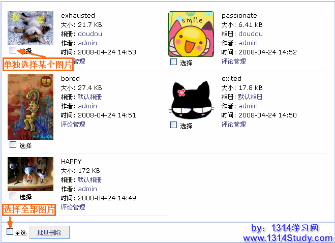 您或许想对用户发表的图片进行编辑,或图片太多或是不符合要求的情况下,对过期或其他不必要的图片进行删除。UCHome 后台提供了方便的图片批量管理功能,可以满足您的这个需求。下面请看详细介绍: