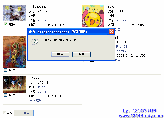 在搜索结果图 2 所示中,如果需要删除第一个图片请选择第一个图片下方的选择框,然后点击 批量删除 按钮,如下图所示: