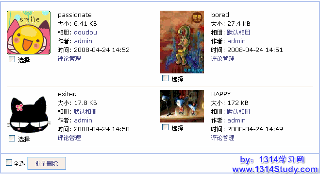 用 UCHome 的管理员帐号登录后台,点击页面右上角所示菜单中的图片,或是点击左侧菜单 批量管理 中的图片,即可看到下图所示: