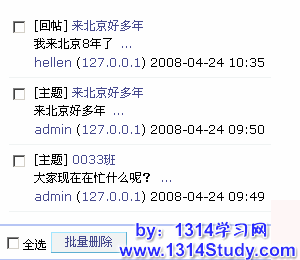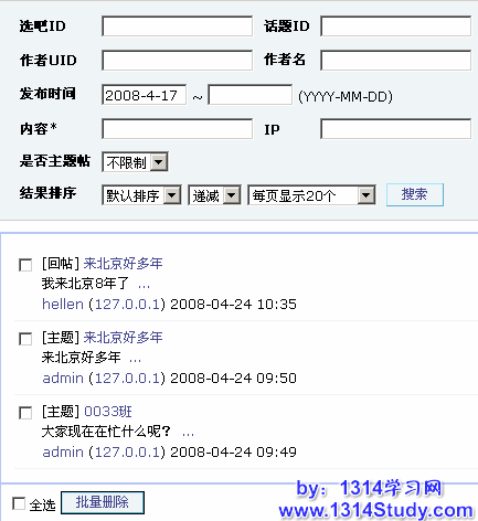 所在位置 => UCenter Home的管理后台 => 批量管理 => 回帖 ,进入回帖以后如下图所示: